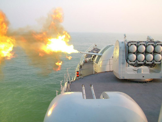 資料圖:中國(guó)海軍戰(zhàn)艦雙聯(lián)裝100毫米艦炮開(kāi)火