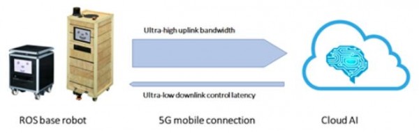 為了提高服務機器人的智能水平,本次合作的機器人將利用5G網絡連接到云端的AI“大腦”,由云端AI對機器人周邊的環境進行識別和分析,并將結果返回給機器人本體。5G的大帶寬提供了機器視覺和雷達數據所需的幾十兆每秒的上行帶寬和室內室外的無處不在的覆蓋,高計算量的AI計算得以在云端而不是本地完成。這樣,機器人獲得了AI增強的同時,計算負載、功耗、尺寸和成本都得以下降。通過5G,機器人之間還可以數據共享,促進機器學習和AI進化。