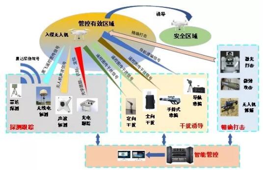系統集成探測識別子系統(雷達探測、無線電偵測、聲波偵測)、跟蹤取證子系統(光電偵查)、反制打擊子系統(定向干擾、全向干擾、導航對抗、激光打擊、微彈、無人機抓捕)等,通過智能監控管理平臺實現“態勢感知-告警-干擾打擊”一體化、智能化服務,探測識別子系統通過雷達識別和信號識別技術探測到監防區域入侵的非法無人機,監管平臺引導光電設備鎖定非法無人機位置進行取證,并自動調度反制打擊子系統對無人機進行信號干擾或武力打擊。