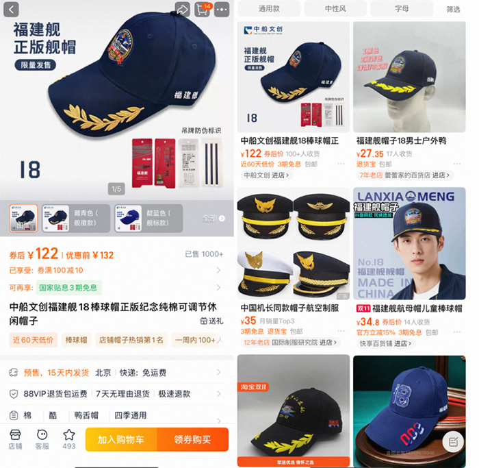 原本在冬季銷售平平的棒球帽,也因福建艦的熱度而銷量大增。福建艦由中國船舶集團(tuán)負(fù)責(zé)研制,中國船舶集團(tuán)的官方淘寶店“中船遠(yuǎn)航”負(fù)責(zé)人介紹,店鋪上架了18艦“福”字帽、“18”福建艦帽子、福建艦棒球帽等多種型號(hào)的單品,很受網(wǎng)友喜愛。其中一款在淘寶天貓上已賣出2000多件,歌手田震曾在公開場合佩戴過該款帽子,很多網(wǎng)友都在淘寶上淘田震同款。