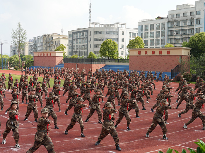 自2018年分設北苑小學以來,面對義烏百校林立的競爭格局,學校立足稟賦、前瞻布局。2019年,經深入調研,明確提出“以少年軍校為載體,打造國防教育辦學特色”;2020年11月,在金華軍分區及義烏市人武部、教育局、團市委等多方支持下,正式申報成立“少年軍校”,2021年完成授牌;2023年被教育部、中央軍委政治工作部聯合認定為“全國國防教育示范學校”。