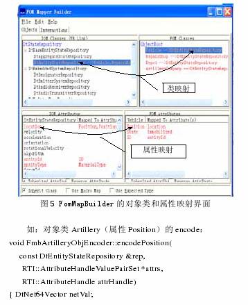 進(jìn)行FONI映射主要是為f將基于RTI的應(yīng)用轉(zhuǎn)化為.y層應(yīng)用(如一維顯示、數(shù)據(jù)}o}放、=位場(chǎng)景等),這一工作我們采用NLVK的VR-Link 來(lái)實(shí)現(xiàn),VR-Link是針對(duì)HLA的獨(dú)仁于協(xié)議的.高層應(yīng)用程序接日。‘自提供丁圖形化工具FomMapBuilder(圖5)}習(xí)守用戶(hù)定義的包含對(duì)象類(lèi)及屬性、交互類(lèi)及參數(shù)的FED(聯(lián)邦執(zhí)行數(shù)據(jù))文件,與VR-Link定義的獨(dú)}i:于協(xié)議的對(duì)象類(lèi)及屬性、交互類(lèi)及參數(shù)進(jìn)行映射。VR-Link采用丁面向?qū)ο蟮腃十十實(shí)現(xiàn),使用FomMapBuilder完成映射后將自動(dòng)生產(chǎn)FONI映射代碼,代碼,},還包含丁對(duì)對(duì)象類(lèi)屬性、交互類(lèi)參數(shù)的編碼 (encode)和解碼(decode),以使RTI信息能被基于VR-Link的.高層應(yīng)用所識(shí)別。