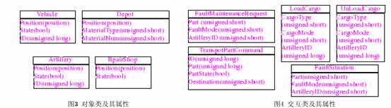 維修保障仿真系統(tǒng)FOM,的對(duì)象類(lèi)包括火炮類(lèi)Artillery、車(chē)輛類(lèi)Vehicle、修理機(jī)構(gòu)類(lèi)RepairShop和倉(cāng)庫(kù)類(lèi)Depot C圖3);交互類(lèi)主要包括故障維修請(qǐng)求類(lèi)FaultMaintenance、故障狀況類(lèi)FaultSituation ,裝載貨物類(lèi)LoadCargo ,卸載貨物類(lèi)UnLoadCargo、運(yùn)輸故障部件命令類(lèi)TransportFaultPartCommand(圖4)等C III于篇幅所限,這里只列出部分分交互類(lèi))。