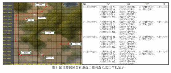 一維勢(shì)態(tài)顯示主要是將仿真過(guò)程及成員以圖形化方式顯示出來(lái),開(kāi)發(fā)工具采用丁NLVK公司的PVD和VR-Link, PVD以實(shí)時(shí)提供淺場(chǎng)的一維勢(shì)態(tài)圖,并顯示實(shí)體、聚合和傳感器;VR-Link是快速建仁HLA應(yīng)用、面向?qū)ο蟮腃十十工具包,使開(kāi)發(fā)主要集中用于仿真應(yīng)用而需要考慮網(wǎng)絡(luò)協(xié)議的細(xì)節(jié)。圖6為團(tuán)維修保障仿真系統(tǒng)的一維勢(shì)態(tài)及交互信息顯示,其實(shí)現(xiàn)過(guò)程如下: