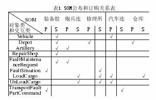 仿真系統(tǒng)中的SOM有5個(gè),分別是裝備股、炮兵連、修理所、倉(cāng)庫(kù)、汽車(chē)連,各SOM的公布(P)和訂購(gòu)(S)關(guān)系如表1所示。