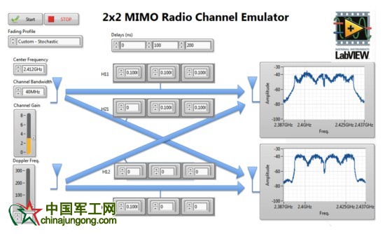 無線信道仿真器是一種可在真實世界中測試無線通信的工具。衰退模式可用來仿真空氣的干擾、反射、移動的用戶以及其它阻礙物理無線環境中的射頻信號的自然現象。在FPGA上對這些數學衰退模式編程,VST可實現實時無線通道仿真器。下面的圖4為LabVIEW環境下的兩臺VST實現2x2 MIMO無線通道仿真器。衰退模式的設置顯示在屏幕的左側和中心。通過頻譜分析儀捕捉衰退模式發出的射頻輸出信號,并顯示在右邊。這些頻譜圖清楚顯示了因衰退模式產生的頻譜零點。