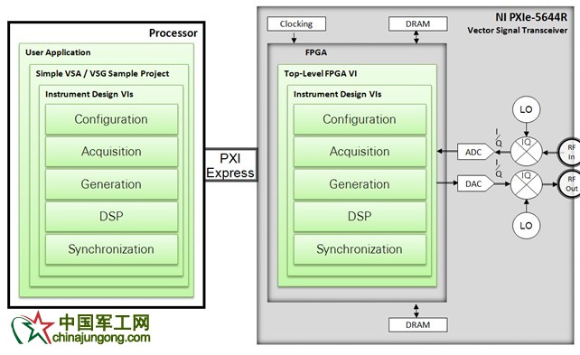 圖2. NI PXIe-5644R矢量信號收發器的架構可允許在主機或設備固件中仿真和部署用戶可編輯的DSP塊。同時也可以對其他輸入/輸出以及內存接口進行修改以作為算法設計的補充。