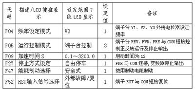 | 頻率設定錯誤 | 功能參數F04應設為V2,主板端子臺外接電位器設定頻率 | |