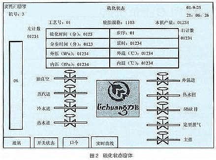在軟件的編程過(guò)程中,人機(jī)界面(MM,)非常重要,因?yàn)樗苯优c操作員產(chǎn)生信息交流,友好的人機(jī)界面要求能真實(shí)再現(xiàn)控制設(shè)備的狀態(tài)以及準(zhǔn)確的采集所需參數(shù)的數(shù)據(jù),這主要依靠VB 6.0的控件組合及原代碼完成。整個(gè)人機(jī)界面包括硫化狀態(tài)畫(huà)面(主畫(huà)面)、實(shí)時(shí)曲線畫(huà)面、數(shù)據(jù)查看畫(huà)面、歷史曲線畫(huà)面、工藝編輯畫(huà)面、報(bào)警畫(huà)面、口令畫(huà)面、開(kāi)關(guān)狀態(tài)畫(huà)面,各畫(huà)面間可以相互切換。當(dāng)然也可根據(jù)用產(chǎn)習(xí)慣編輯不同的人機(jī)界面,具有很好的靈活性。