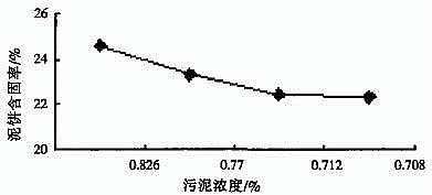 在臥螺離心機操作參數不變的情況下, 污泥濃度對泥餅含固率的影響見圖 3、圖 4。圖 3、圖 4 分別是差轉速為 6 r/min、5 r/min 時的情況, 從圖 3 和圖 4 均可看出, 隨著污泥濃度的降低,泥餅含固率也隨之降低。當污泥濃度降低至 0.426%時, 其泥餅含固率為 20.5%, 從這個趨勢來看, 如果污泥濃度降低至 0.4%以下, 其泥餅含固率很可能就會小于 20%。
