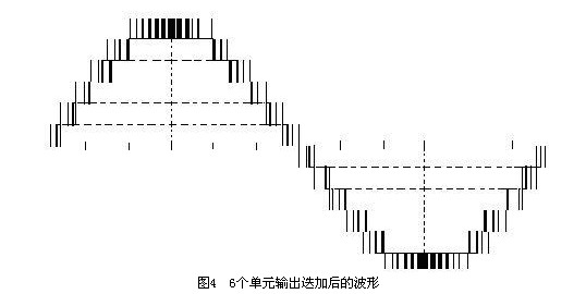 系統采用三次諧波補償技術提高了電源電壓利用率,利用了調制信號預畸變技術,使電壓利用率近似于1。系統還采用了先進的載波移相技術,它的特點是單元輸出的基波相疊加、諧波彼此相抵消。所以串聯后的總輸出波形失真特別小。多個單元迭加后的理論輸出波形如圖4所示(圖中是六單元疊加)。