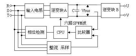 再生能量通過功率單元來處理,見圖5所示。電機處于發電狀態,功率單元母線電壓Vbus升高,當母線電壓超過電網電壓的1.1倍時,CPU根據比較器和相位檢測的結果輸出六路SPWM波形,使逆變塊A中的IGBT工作,通過輸入電感,電動機的再生能量最后通過移相變壓器回饋到電網,裝置充分利用了移相變壓器對諧波的抵消作用,具有對電網無諧波污染、功率因數高、控制簡單、損耗小,返回到電網諧波小于5%。