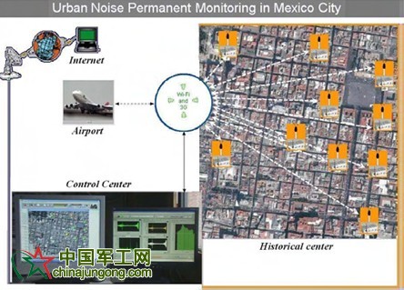無線監控系統中的每個節點包含一個半英寸預極化麥克風、一張測量噪音水平的數據采集卡、一臺工業計算機和Wi-Fi或3G無線連接互聯網。  麥克風安裝在離地4米的防水箱內。 節點每30秒測量一次噪音水平,每5分鐘將數據傳回至控制中心。