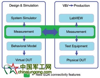 連通設(shè)計(jì)和測(cè)試軟件環(huán)境的好處之一是,它允許設(shè)計(jì)工程師在設(shè)計(jì)過(guò)程的早期階段就使用更為豐富的測(cè)量算法。這不僅讓工程師在設(shè)計(jì)過(guò)程中及早地了解其設(shè)計(jì)相關(guān)的重要信息,而且還能夠?qū)?lái)自驗(yàn)證/確認(rèn)過(guò)程的測(cè)量數(shù)據(jù)與仿真建立關(guān)聯(lián)。增加EDA和測(cè)試環(huán)境的連通性的第二個(gè)好處是,它允許測(cè)試工程師在設(shè)計(jì)過(guò)程中更快地開(kāi)發(fā)工作測(cè)試代碼——最終減少?gòu)?fù)雜產(chǎn)品的上市時(shí)間。