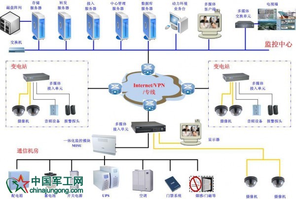 前端監控現場主要包括各變電站和通訊機房,由DVR/DVS,攝像頭,報警設備等構成,實現了對現場的24小時不間斷監控。